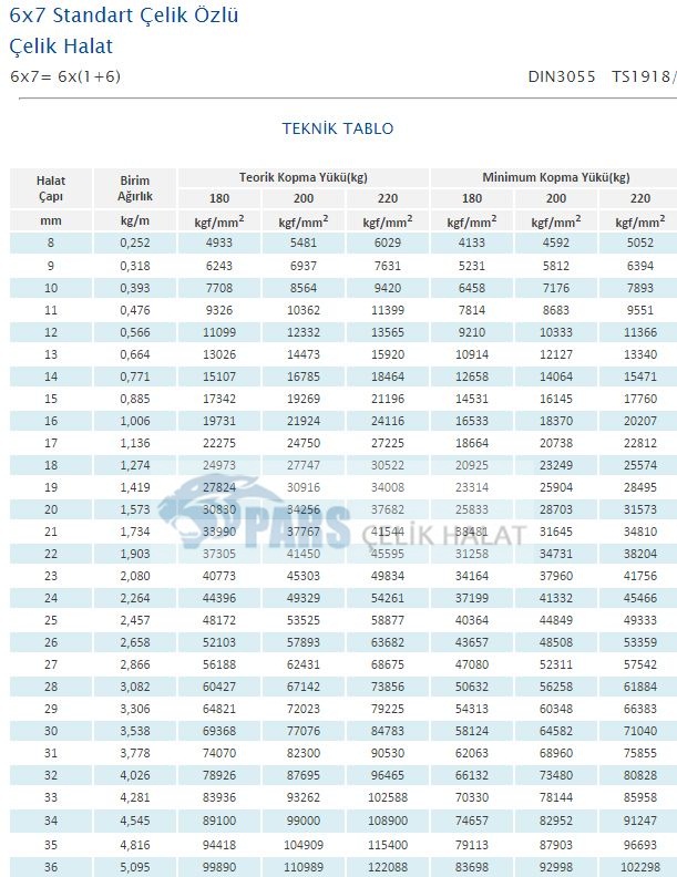 Yüksek mukavemetli yüklerinizi kaldırmak için kullanılan tonajlı çelik halatlardır. 6 kolda her kola özel 7 damardan oluşmaktadır. Ortadaki ana gövde çelik özlüdür.
