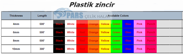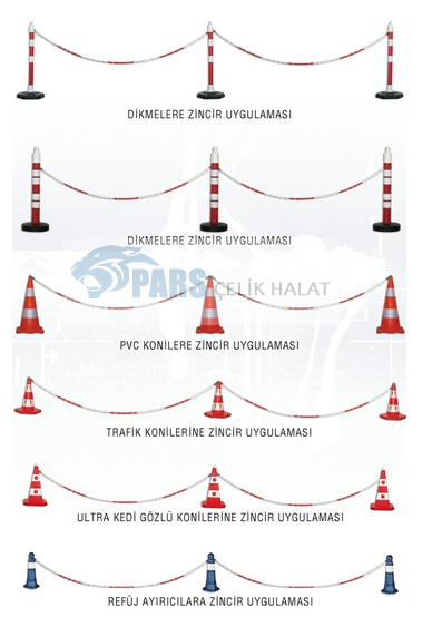 Plastik zincirler, madde yapısından dolayı yoğunluğu düşük zincirlerdir, Genellikle kırmızı, beyaz ve sarı, siyah renkleri kullanılır. Reklam, uyarı, yön verme, alan koruma, gibi uygulamalarda kullanılır. Bir metre, iki farklı renkten oluşmaktadır. Tek parça aynı renk modelleride mevcuttur. İstenilen ölçü ve metrajlarda temin edilir. Fiyatı metre üzerinden değerlendirilir. En çok kullanılan milimetreler 6 ve 8 milimetredir.