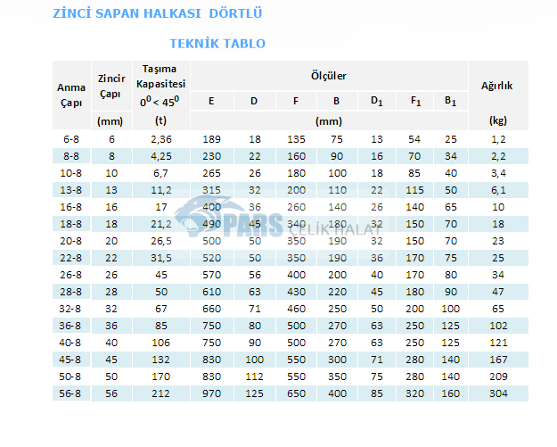 Dörtlü zincir sapan halkası, 3 ve 4 bacaklı sapanlar için kullanılan ana zincir halkasıdır. Tekli zincir sapan halkasından farklı olarak, iki adet yavru halkası mevcuttur. Bu yavru halkalar, ayrı asılacak zincir bacak ve kolları içindir. Zincir sapan halkası dörtlü Yavrulu halka olarakta bilinir. Testli ve sertifikalıdır. Üzerinde SWL tonaj belirten damga mühürlüdür. Bu üründe aynı zaman çelik halat sapanlar için kullanılabilir. Yüksek mukavemetli alaşımlı çelikten imal edilmiştir. Teknik Bilgiler Aşağıdaki Tabloda Verilmiştir.